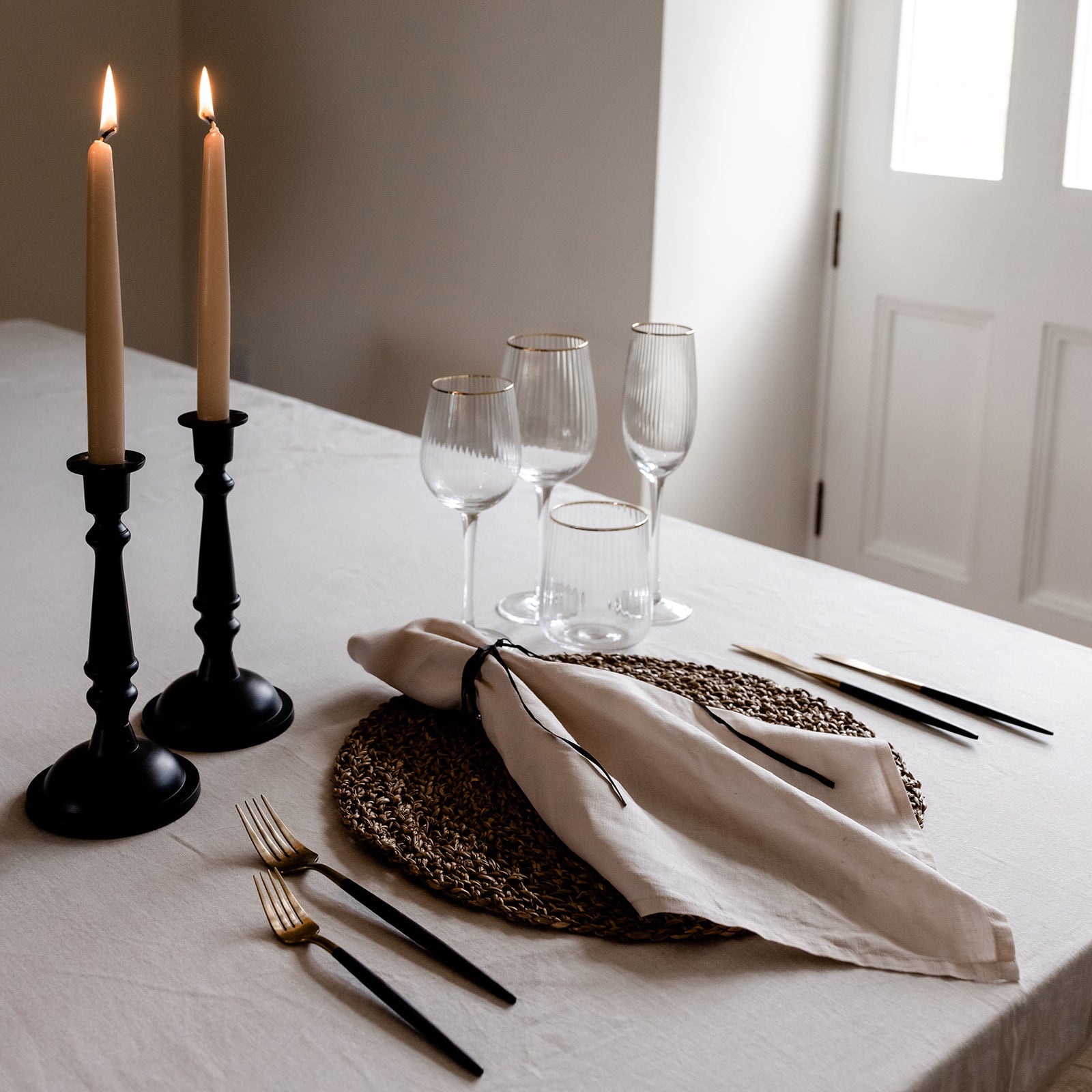 Our gold rim ribbed glassware collection consists of a champagne glass, red wine glass, white wine glass and water glass.